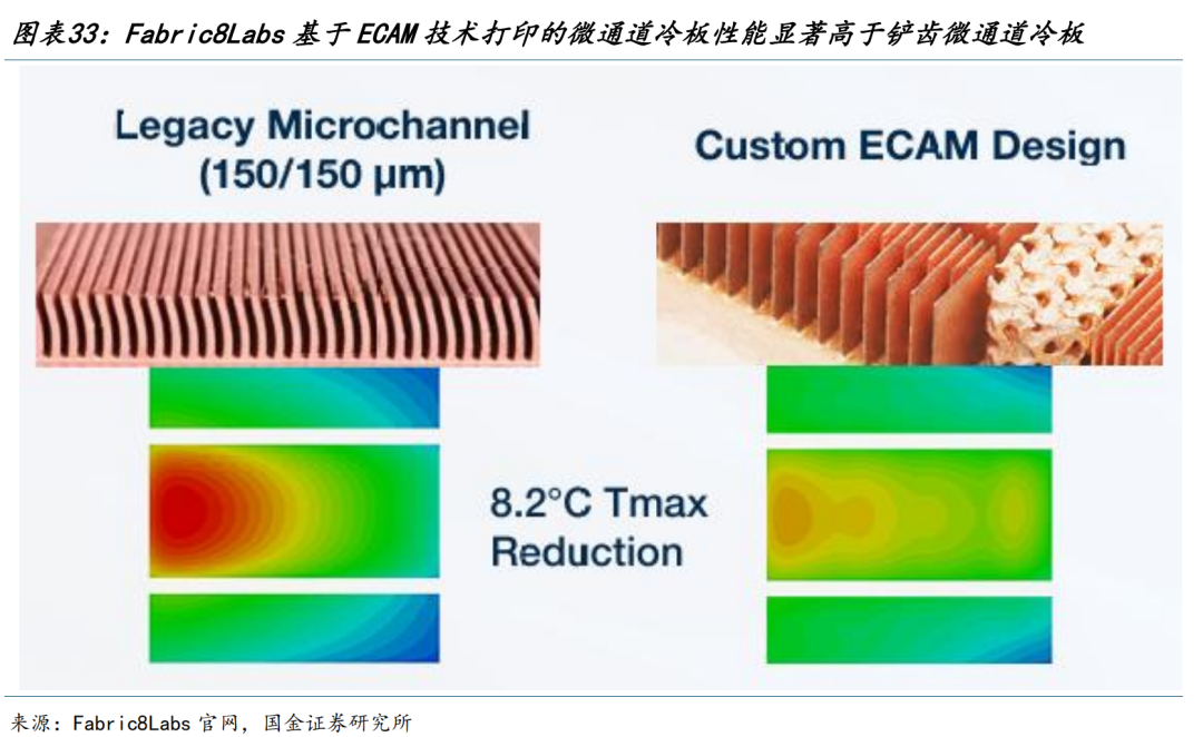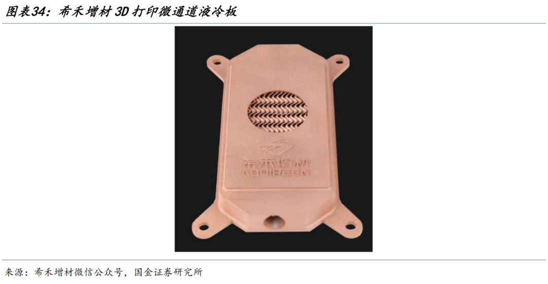 铜材料打印较难但可突破,产业已有3D打印液冷板产品落地:铜由于对场景3D打印设备所使用的红光波段有较高的反射率难以加工,但产业已有采用绿光激光器、蓝光激光器的设备方案,可以显著降低铜的反射率。目前CoolestDC基于于EOS DMLS技术和高密度EOS Copper CuCP工艺开发一体式冷板,可承受6bar以上水压让GPU工作温度降低近50%;Fabric8Labs采用独特的电化学增材制造(ECAM)技术打印高精度冷板,可实现对芯片热点区域的精准冷却,性能显著高于采用铲齿工艺的微通道冷板;希禾增材通过绿光3D打印技术实现微通道液冷板制造,打印件最小壁厚可达0.05mm,致密度超过99.8%。整体来看,3D打印液冷板产业化落地是大势所趋。