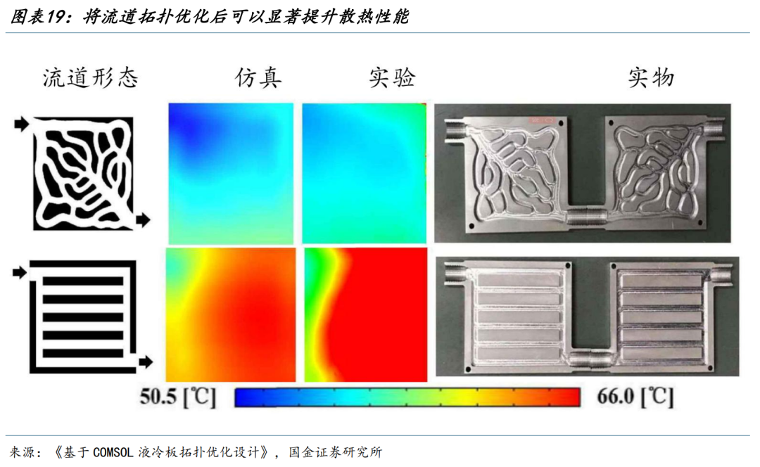 3D打印首先解放了流道设计限制,持续提升散热性能。对液冷板性能影响最大的是液冷板的流道设计,需要考虑冷板上总的热负载、单个器件的热耗密度、系统提供的冷却液流量、要求的器件表面温度和冷却液入口温度等。例如将直线流道通过拓扑优化改为类似植物叶脉状的流道能够显著提升散热性能。