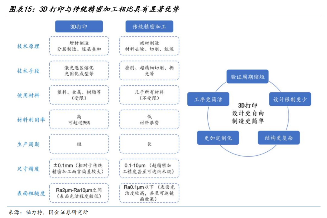 3D打印在可加工材料、加工精度、表面粗糙度等方面与传统精密加工还存在差距,但与此同时也具有不可替代的巨大优势: