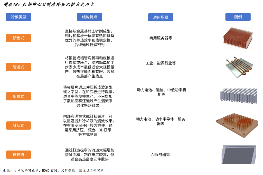 液冷板常见的设计方案包括铲齿式、管道式、曲折式、针状式、微通道等,其中铲齿式是目前数据中心场景中占比最高的类型。