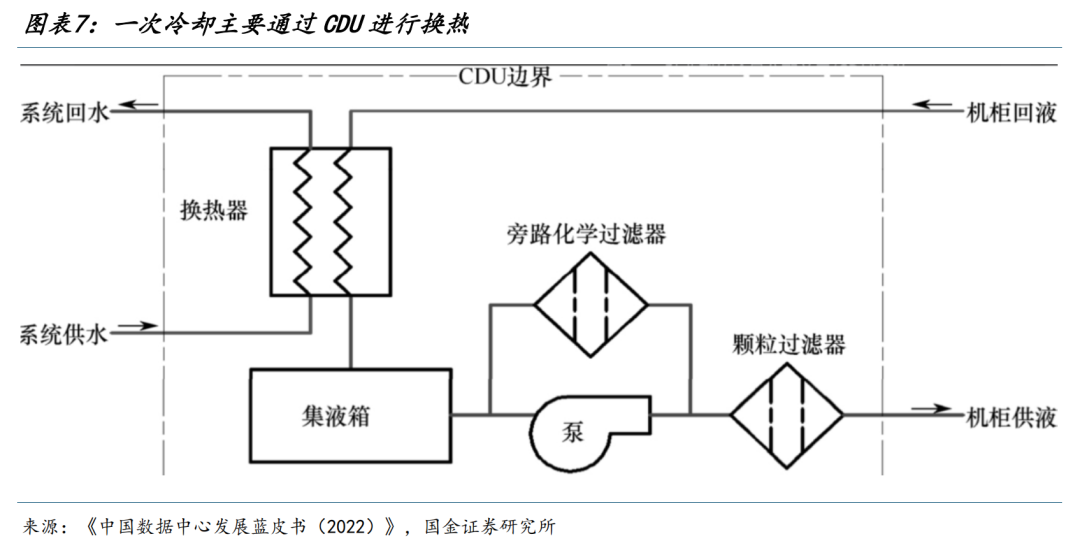 液冷系统主要由冷源、液冷分配单元(CDU)、快速接头、主循环水泵及管道组成。热量经过一次冷却、二次冷却完成传递,其中一次冷却过程主要将芯片端热量传递至CDU,受热后的高温冷却液在CDU和二次冷媒进行换热,降温后回流至芯片端完成一轮循环。