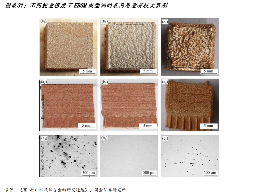 也就是说纯铜或铜合金进行3D打印的技术路线可行,但涉及蓝/绿光激光器应用、粉末球形度选择、打印技术路线(SLM/LMD/EBSM/BJ等)、激光器功率、扫描速率/间距、光斑直径等较多变量,我们认为技术壁垒较高。