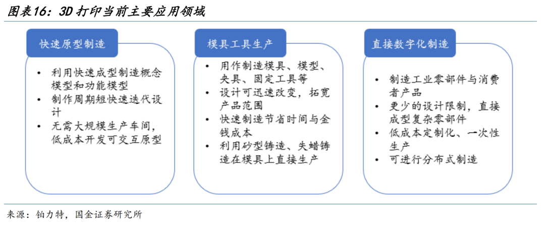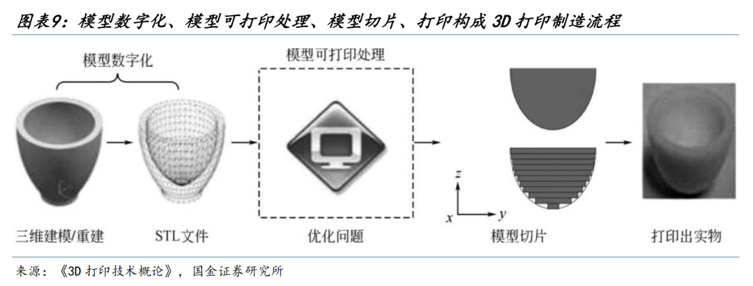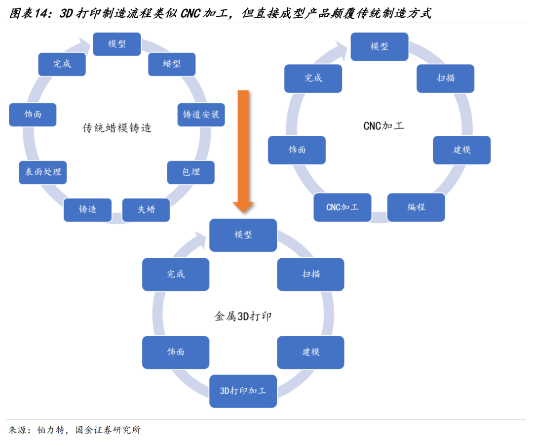 从减材制造到增材制造,3D打印突破传统制造方式限制,带来完全不同的设计理念。传统机械加工方法主要是减材制造,在其制造过程中材料逐渐减少以完成最终成型,或使用模具完成等材制造。3D打印所属的增材制造则打破了传统制造方式限制,利用数字化技术直接完成产品成型,让3D打印完全颠覆了原有制造业设计方式,创造了为增材制造而设计的产品。