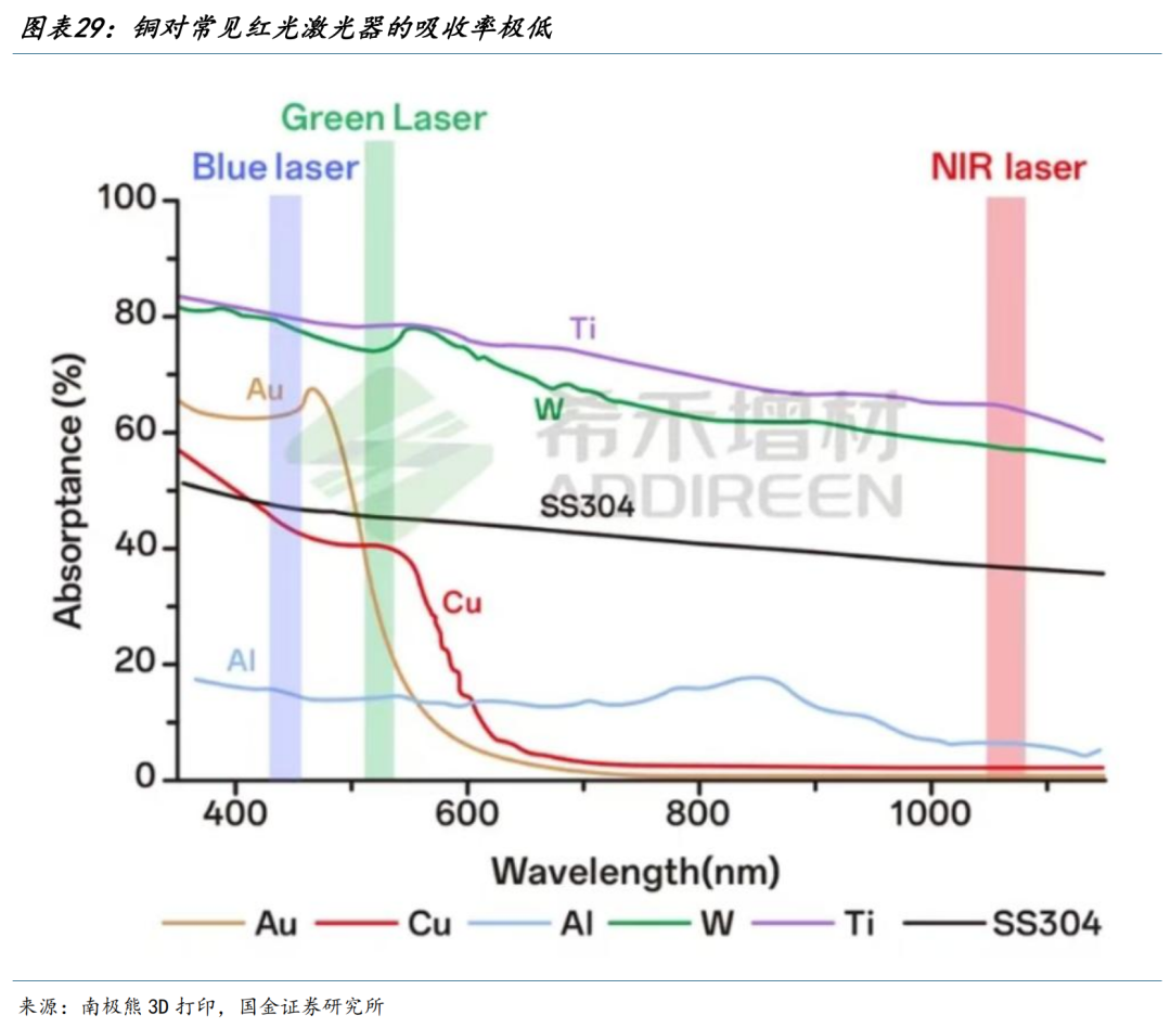但要实现铜的3D打印较为困难,主要由于纯铜对于主流的激光器波长会有很高的反射率,通过选区激光熔化和激光融化成形时难以沉积,还容易产生球化、孔洞、微裂痕等冶金缺陷。一般激光器波长大于1060nm,进行铜3D打印需要选用例如450nm波光的蓝光激光器或515nm的绿光激光器,可以显著降低铜的反射率。