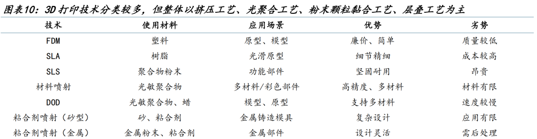 3D打印技术分类较多,但整体以挤压工艺、光聚合工艺、粉末颗粒黏合工艺、层叠工艺为主。