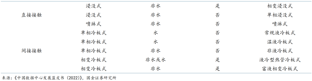数据中心液冷按冷却液接触形式分为直接接触和间接接触(通过高导热率固体导热材料接触电子芯片)两大类,再按接触方式、冷却液类别、冷却液是否相变进行梯次划分。一般认为液冷的实现方式有8种。