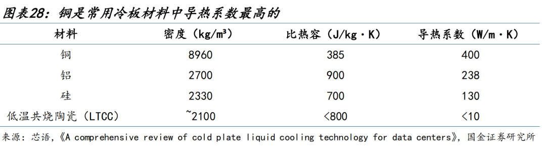 在较高的冷却液流量和热功率下,铜和铝是最常见的冷板材料,而铜的导热系数更高散热效果更好。