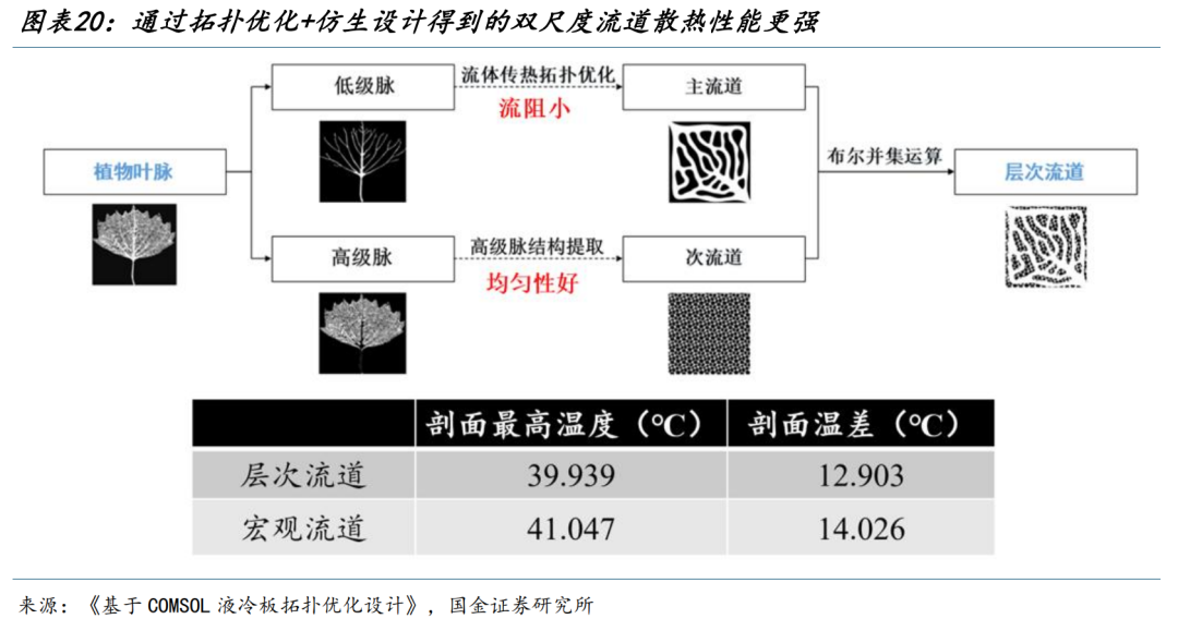 而由于3D打印技术通常是对产品分层进行加工,流道设计的复杂化对加工时间、质量的影响显著弱于CNC等方式,让流道设计有持续优化的空间。例如在上述流道设计优化的基础上,还通过拓扑优化+仿生设计可以进一步优化为双尺度流道,其中宏观流道可以提高流动的均匀性,降低功耗散,微观叶脉流道可以有效的更加流热交换面积,增强热传导提升散热性能,且增强均温性。