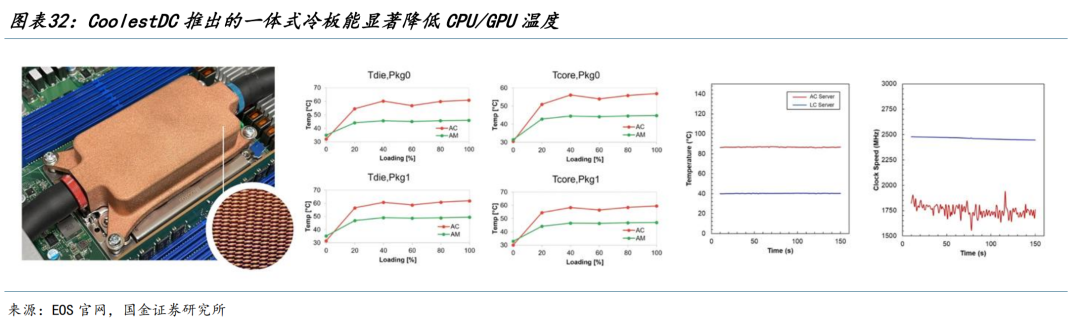 CoolestDC基于EOS DMLS技术和高密度EOS Copper CuCP工艺开发一体式冷板。冷板一体式设计无垫片、无接头并可承受6bar以上水压。和风冷相比CPU芯片和内核温度降低10度,GPU工作温度降低接近50%。