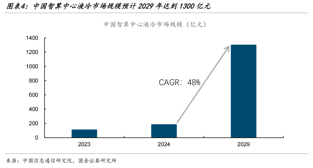 根据中国信息通信研究院数据,2024年我国智算中心液冷市场规模达到184亿元,同比增长66%,2029年预计进一步达到1300亿元。