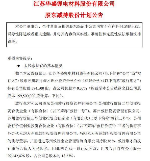 11月4日,华盛锂电(688353.SH)发布公告,因股东自身资金需求,敦行聚才拟通过集中竞价的方式减持所持公司股份。敦行聚才本次拟减持股份数量合计不超过59.45万股,拟减持股份占公司总股本的比例不超过0.37%。