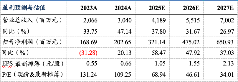 我们维持公司2025-2027年归母净利润预测为3.2/4.8/6.5亿元,对应当前市值动态PE为69/47/34倍,维持“增持”评级。