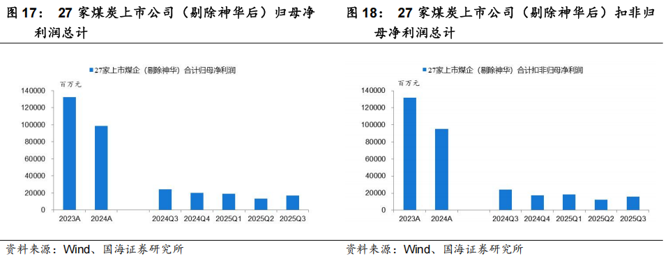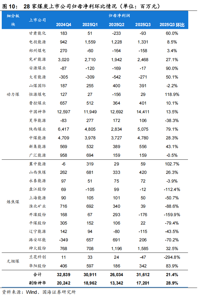 我们重点关注的28家煤炭上市公司,2025Q3合计实现营业收入3022.96亿元,环比+11%;合计实现归属母公司净利润316.12亿元,环比+21%;合计实现扣非后归属母公司净利润301.71亿元,环比+20%。如果剔除对行业影响较大的中国神华,27家煤炭上市公司,2025Q3合计实现归属母公司净利润172.01亿元,环比+28.93%,业绩环比改善主要是由于煤价环比上升以及龙头企业控本降费所致。
