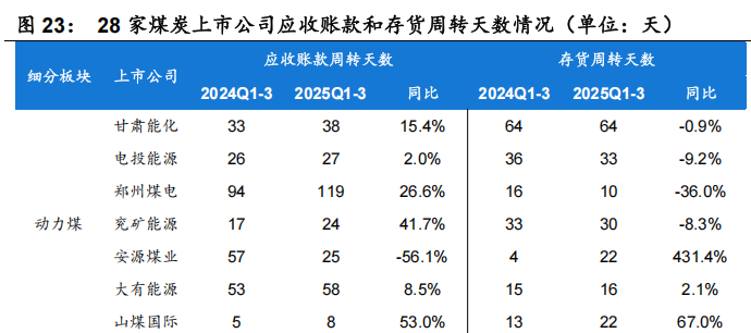 应收账款方面,2025年前三季度28家煤炭上市公司应收账款周转天数同比上涨,回款能力有所走弱,2025年前三季度28家煤炭上市公司应收账款周转天数平均为31天,同比增长5天,同比上涨19.5%;存货周转方面,存货周转天数28天,同比增长5天,同比上涨20.0%