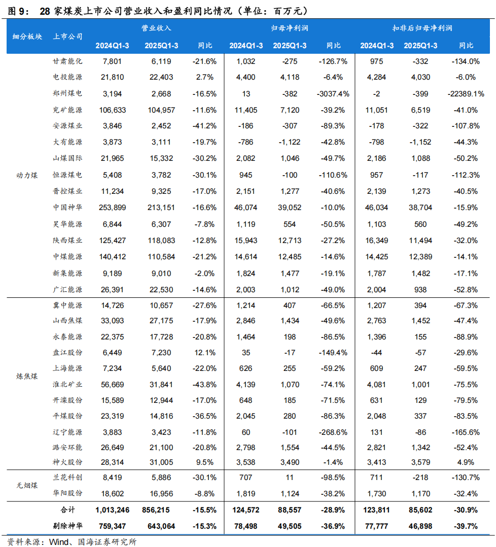 1.2、受煤价回落影响,2025前三季度主要煤企业绩同比下跌