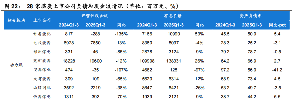 2025年前三季度煤企经营性现金流、资产负债率同比下降。28家煤炭上市公司2025年前三季度经营性现金流合计为1797.34亿元,同比-48.419亿元,同比-21%;有息负债合计为5730.71亿元,同比+21.46%。资产负债率平均为51.3%,同比-0.2pct;如果剔除掉中国神华,27家煤炭上市公司2025年前三季度经营性现金流合计为1144.81亿元,同比-301.68亿元,同比-20.86%;有息负债合计为5310.44亿元,同比+23.76%。资产负债率平均为52.3%,同比-0.3pct。