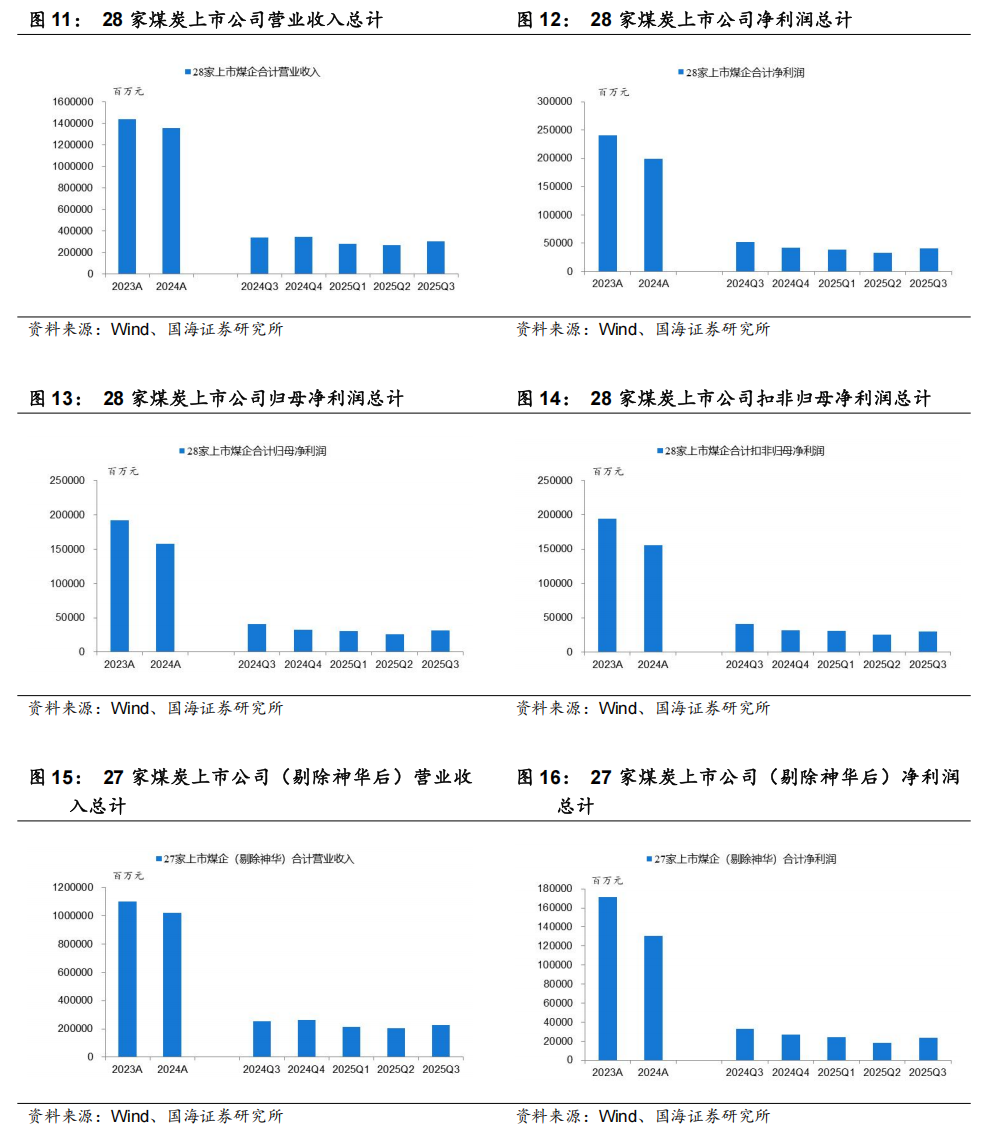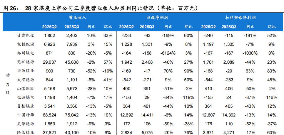2025年第三季度:煤价环比回升,主要上市煤企业绩环比改善。2025Q3,夏季用电较旺背景下火电需求同比增长,安监升级、降雨等因素影响下国内三季度产量同比收缩,供需错配下煤价Q3回暖显著,2025Q3秦港动力煤(Q5500,山西产)均价为672元/吨,环比+6.47%;2025Q3京唐港主焦煤(山西产)均价为1562元/吨,环比+18.76%。煤价回升叠加龙头公司控本降费,主要上市煤企2025Q3业绩环比显著改善。我们重点关注的28家煤炭上市公司,2025Q3合计实现营业收入3022.96亿元,环比+11%;合计实现归属母公司净利润316.12亿元,环比+21%;合计实现扣非后归属母公司净利润301.71亿元,环比+20%。如果剔除对行业影响较大的中国神华,27家煤炭上市公司,2025Q3合计实现归属母公司净利润172.01亿元,环比+28.93%。