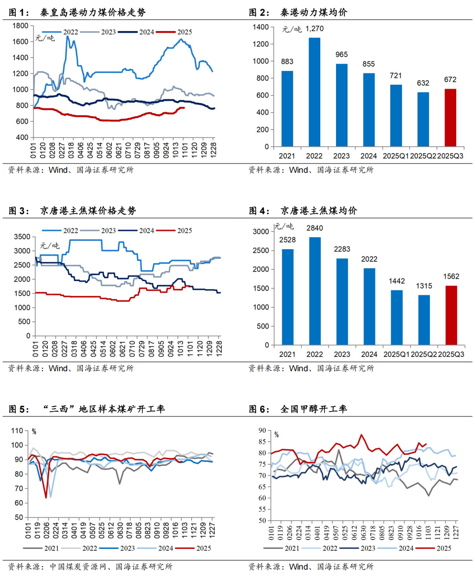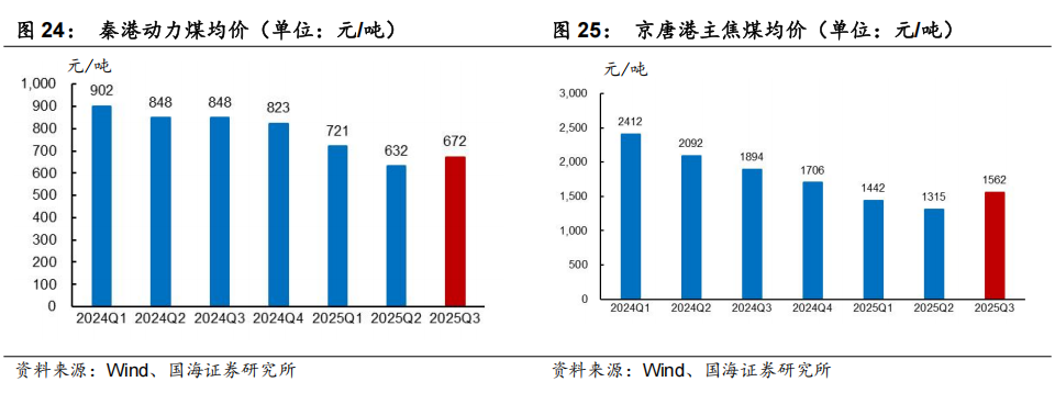 2025Q3煤价环比回升。分煤种以及均价水平来看,2025Q3秦港动力煤(Q5500,山西产)均价为672 元/吨,环比+6.47%;2025Q3京唐港主焦煤(山西产)均价为1562 元/吨,环比+18.76%。