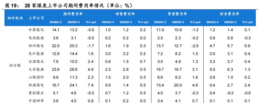 2025年前三季度期间费用方面,绝对值同比下降,费用率受营收下降影响有所提升。从绝对值来看,2025年前三季度28家煤炭上市公司累计期间费用607.74亿元,同比-3.1%,其中,销售费用733.98亿元,同比-1.7%,管理费用409.72亿元,同比-5.6%,财务费用124.62亿元,同比+4.8%。从相对值来看(算数平均值方法),2025年前三季度28家煤炭上市公司的期间费用率为12.20%,同比+1.24pct,其中,销售费用率为1.01%,同比+0.16pct,管理费用率为8.56%,同比+0.52pct,财务费用率为2.63%,同比+0.56pct。综合来看,在煤价同比下降背景下,多数煤企通过优化债务结构、成本控制等方式,降低成本费用,但受营收同比下降影响,费用比率有所提升。