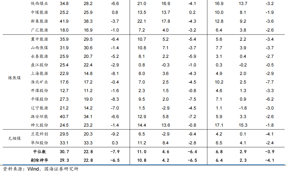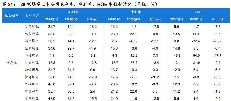 1.5、2025年前三季度煤企销售毛利率、净利率、ROE中位数同比下降