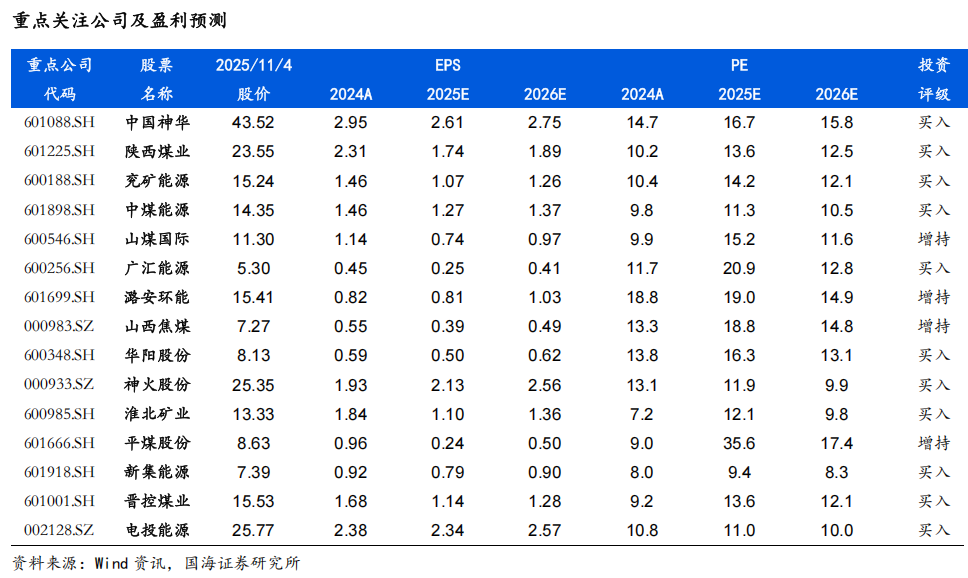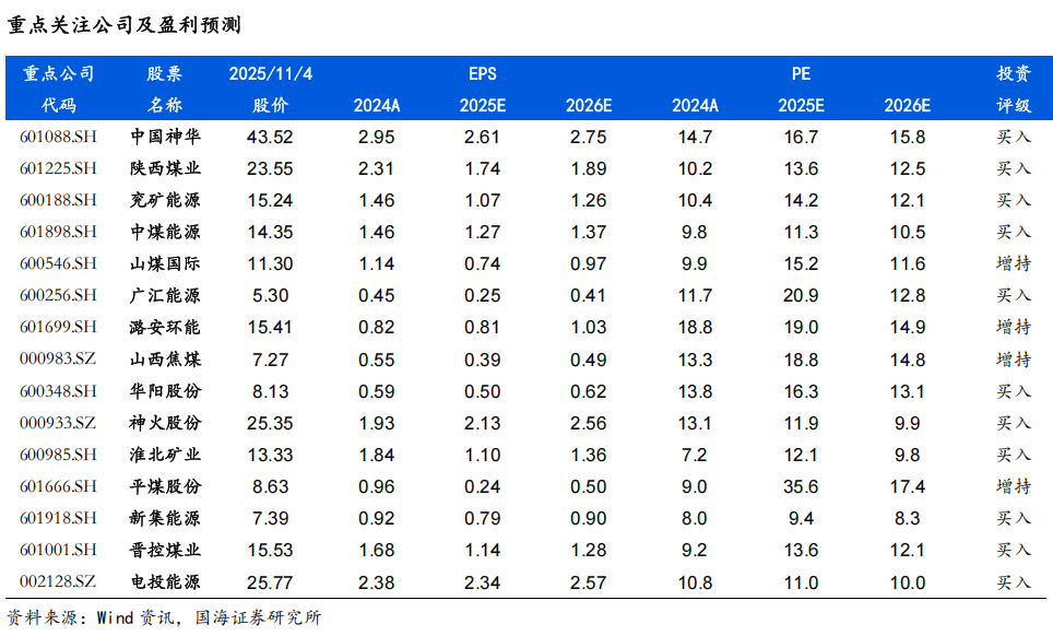 投资策略:整体看,2025年前三季度煤价仍同比下跌,煤企业绩同比仍回落,但在“反内卷”影响之下,Q3煤炭价格已环比明显修复,煤企Q3业绩环比亦明显改善,展望后续,我们预计查超产政策对供给的约束影响具有持续性,叠加即将步入冬季旺季需求具有强支撑,港口库存低位徘徊,煤价有望保持震荡偏强态势,同时公司成本端仍在持续优化,故此煤企业绩低点或已显现,行业呈现“柳暗花明又一村”景象。另一方面,市场对现阶段煤价的悲观认识或亦已被充分定价,2025Q3主动型基金重仓股中持有煤炭板块比例已降至0.30%,持仓比例处于2008年以来较低水平(23%分位数),板块拥挤度低,赔率优势明显。综上,在煤价回暖、板块低拥挤度背景下,低估值、高股息率、现金奶牛的煤炭板块底部配置价值正逐步凸显。2025年以来,国家能源集团、山东能源集团、中国中煤能源集团等多家煤炭央国企对旗下上市公司启动增持或资产注入计划,亦释放利好,彰显煤企发展信心、增厚企业成长性与稳定性。从大方向来看,煤炭开采行业供应端约束逻辑未变,需求端可能阶段性起伏波动,价格亦呈现一定震荡和动态再平衡,头部煤炭企业资产质量高,账上现金流充沛,呈现“高盈利、高现金流、高壁垒、高分红、高安全边际”五高特征。建议把握低位煤炭板块的价值属性,维持煤炭开采行业“推荐”评级。重点关注:(1)稳健型标的:中国神华、陕西煤业、中煤能源、电投能源、新集能源。(2)动力煤弹性较大标的:兖矿能源、晋控煤业、广汇能源。(3)焦煤弹性较大标的:淮北矿业、平煤股份、潞安环能、山西焦煤。