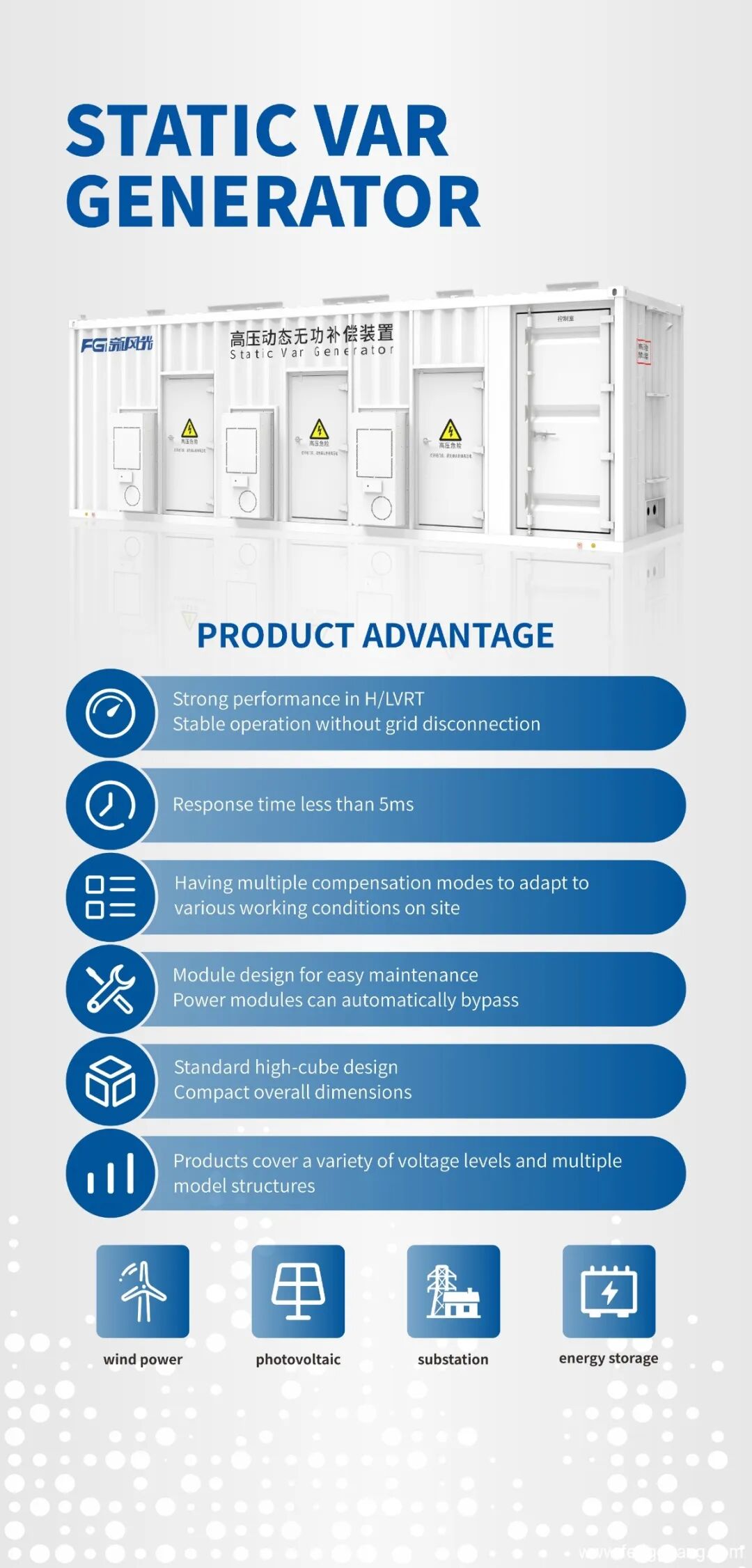 FGI focuses on five major business segments: motor drive and energy-saving control, power quality management, high-end rail transit equipment, explosion-proof and intelligent control systems for coal mining, and intelligent energy storage systems. Its solutions are widely used in power, coal, cement, metallurgy, mining, rail transit, photovoltaic and wind power, oil, chemical, and municipal industries, providing customers with tailored energy-saving, intelligent control, and power-quality solutions.