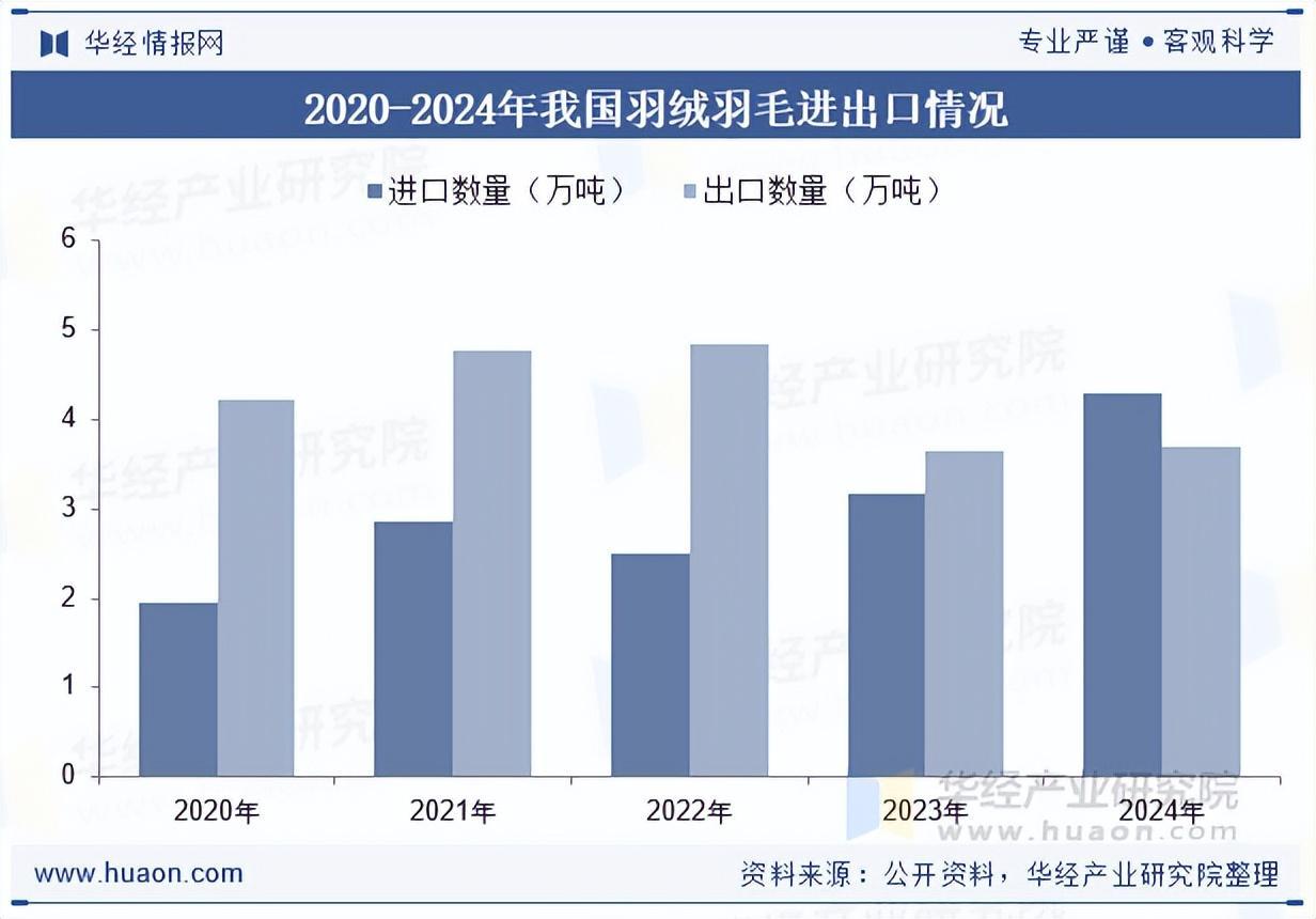 多年来,随着下游羽绒服装、寝具等羽绒制品行业市场规模的增长,羽绒羽毛生产加工行业市场规模保持持续稳定增长。受气候、消费水平以及追求高舒适度、天然、低碳、时尚生活的影响,羽绒服装、羽绒寝具等制品在发达国家和地区受到欢迎,每年我国有大量的羽绒羽毛材料、羽绒制品出口,我国的羽绒行业在世界上占有重要地位。据统计2024年我国羽绒羽毛进口约为4.3万吨,出口约为3.7万吨。