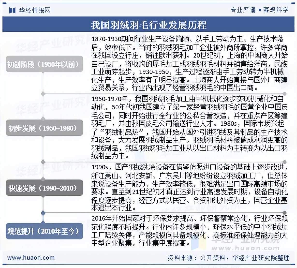 我国羽绒羽毛生产加工业已有100多年历史,行业发展从无到有、从小到大、由弱到强,1870-1930年以手工劳作为主,受制于外商;20世纪初民族资本设厂,开启自主经营;1950-1970年通过公私合营与机械化改造实现规模化发展;80年代借技术引进转型制品生产,出口结构升级;90年代设备国产化但效率不足,直至21世纪民营资本主导推动自动化,行业高速发展;2016年后环保严管倒逼产业整合,规模化企业主导市场,行业迈向集约化、高端化发展新阶段。