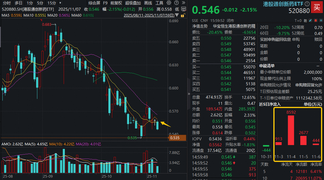 港股通创新药波动再度加大,午后加速走低,港股通创新药ETF(520880)场内跌2.15%,失守10日线,收盘价已落于所有均线之下。阶段低位之际,低吸资金涌动,场内全天溢价。此前4日,逾亿元资金连续增仓520880。
