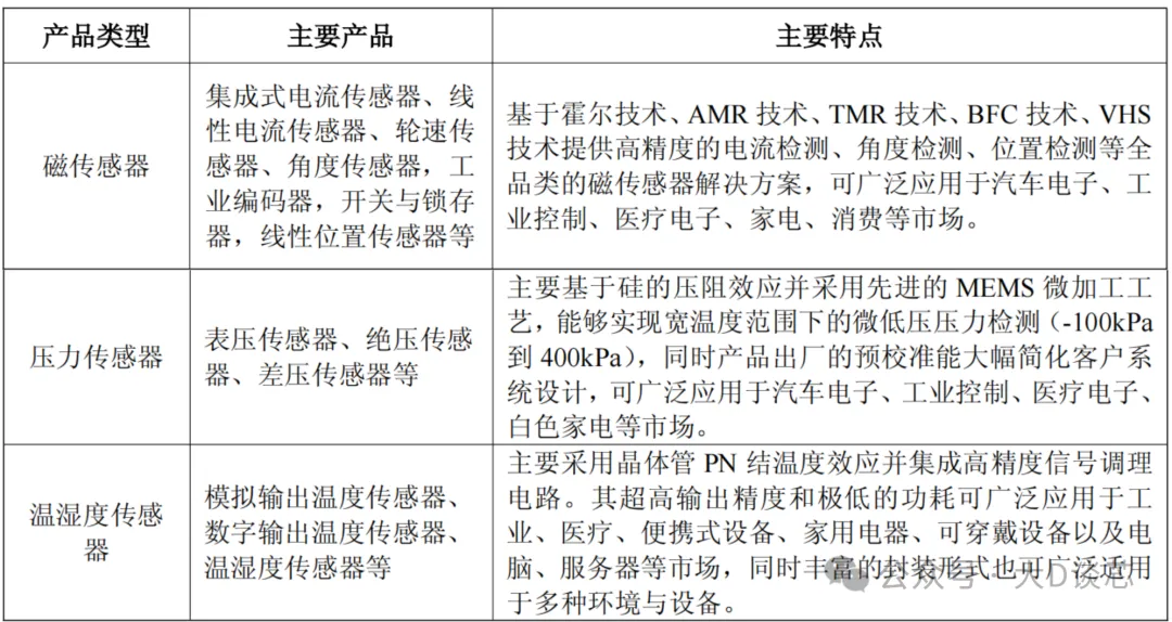 公司传感器产品主要包括磁传感器、压力传感器、温湿度传感器,具体如下: