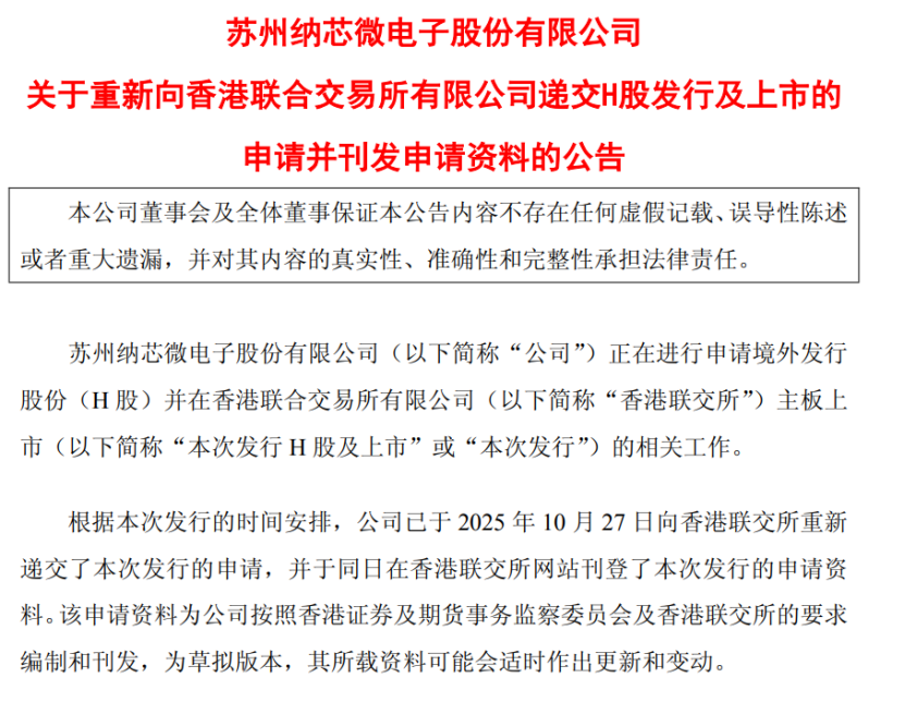根据公司公告,苏州纳芯微电子股份有限公司正在进行申请境外发行股份(H 股)并在香港联合交易所有限公司主板上市的相关工作。根据本次发行的时间安排,公司已于2025年10月27日向香港联交所重新递交了本次发行的申请,并于同日在香港联交所网站刊登了本次发行的申请资料。
