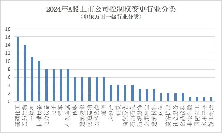 从行业视角来看,2024年A股上市公司控制权变更较为频繁的行业主要有基础化工、医药生物、计算机、机械设备、电力设备、电子、汽车以及有色金属等。这些行业发生控制权变更交易的数量分别为16家、14家、11家、10家、8家、8家、8家、8家。倘若剔除变更一致行动关系、国有股权无偿划转、家族财产分配等非市场化的交易方式,上述行业发生的交易数量则分别为7家、6家、5家、5家、4家、5家、6家、4家。