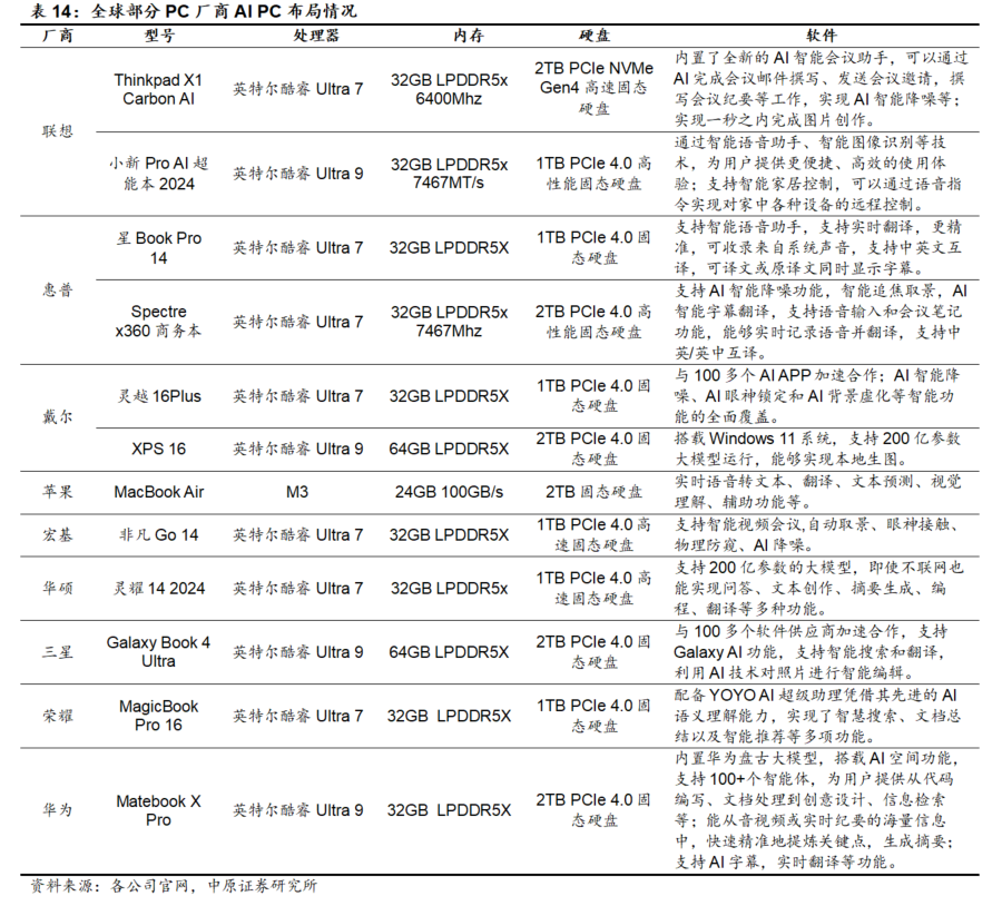 联想、惠普等PC厂商密集发布AI PC新品。AI PC是终端、边缘计算和云技术的颠覆性混合体,它不仅重新定义生产力,也将推动PC产业生态加速迭代。头部PC厂商视AI PC为重要的创新机会,PC行业迎来iPhone时刻。随着英特尔、 AMD等芯片厂商陆续推出适用于AI PC的计算芯片,以及Windows向Windows11过渡,头部PC厂商联想、惠普、戴尔、苹果、宏碁、华硕、三星、荣耀、华为等都在2024年陆续推出全新的AI PC产品。