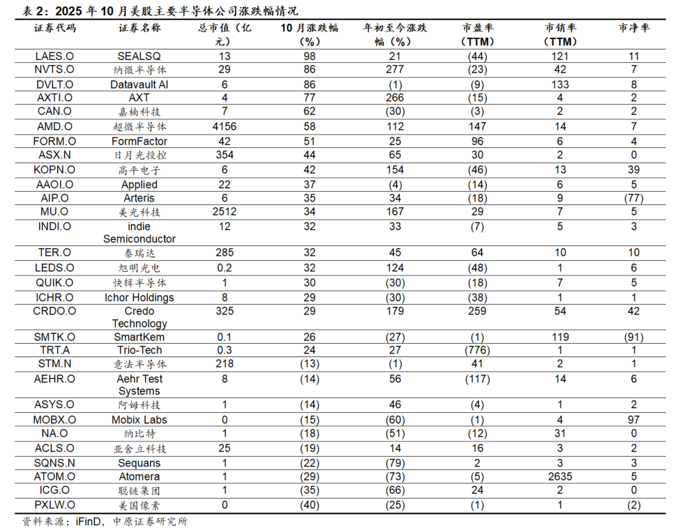 2025年10月美股半导体板块上涨家数远多于下跌家数,2025年10月涨幅排名前十的公司分别为SEALSQ(98%)、纳微半导体(86%)、Datavault AI(86%)、AXT(77%)、嘉楠科技(62%)、超微半导体(58%)、FormFactor(51%)、日月光投控(44%)、高平电子(42%)、Applied(37%)。
