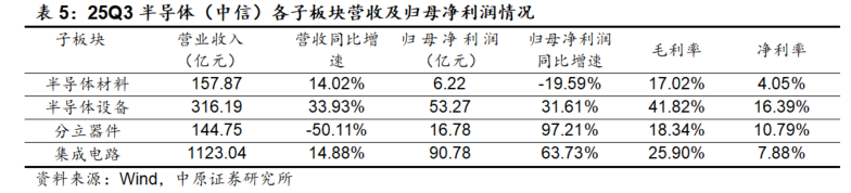 半导体行业25Q3营收及归母净利润持续稳健增长。2025年前三季度半导体行业(中信)营业收入为4973.45亿元,同比增长10.15%,25Q3半导体行业(中信)营收为1741.84亿元,同比增长6.07%,其中集成电路、分立器件、半导体设备和半导体材料板块分别同比+14.88%、-50.11%、+33.93%、+14.02%;2025年前三季度半导体行业(中信)归母净利润为394.68亿元,同比增长48.93%,25Q3半导体行业(中信)归母净利润为167.06亿元,同比增长23.99%,其中集成电路、分立器件、半导体设备和半导体材料板块分别同比+63.73%、+97.21%、+31.61%、-19.59%。