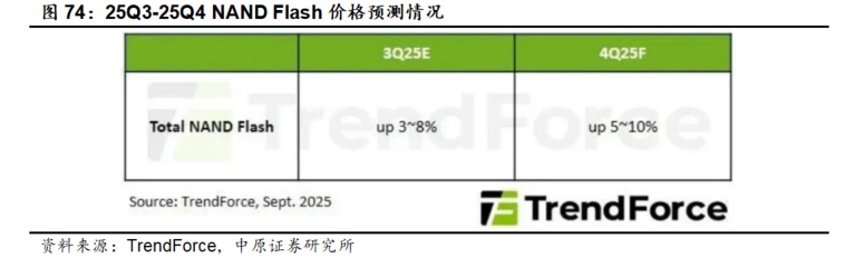 TrendForce预计25Q4 NAND Flash价格将持续上涨。根据TrendForce集邦咨询最新调查,由于消费市场需求提前在上半年被透支,下半年旺季未能如预期发挥效应,市场原本普遍预估4Q25价格将进入盘整;然而,HDD供给短缺与过长交期,使CSP(云端服务供应商)将储存需求快速转向QLC Enterprise SSD,短期内急单大量涌入,造成市场明显波动;同时,SanDisk(闪迪)率先宣布调涨10%,Micron(美光)也因价格与产能配置考量暂停报价,使得供应端氛围由保守转为积极;在此外溢效应带动下,预估NAND Flash 25Q4各类产品合约价将全面上涨,平均涨幅达5-10%。