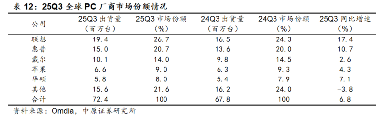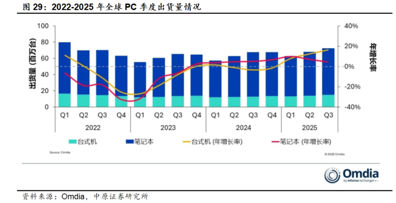 全球PC出货量25Q3同比增长6.8%,延续复苏态势。根据Omdia的数据,2025年第三季度,台式机、笔记本及工作站的总出货量同比增长6.8%,达到7200万台;其中,笔记本(包括移动工作站)出货量增长4%,达到5720万台,台式机(包括台式工作站)出货量增长17%,达到1520万台。随着Windows 10服务终止的最后期限不到一周,全行业的设备更新需求仍是推动出货量和激活量增长的主要因素。