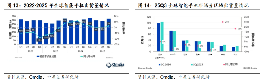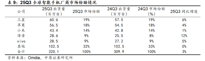 25Q3三星、苹果、小米、传音、vivo市场份额位列前五位。根据Omdia的数据,2025年第三季度,三星以19%的市场份额连续第三个季度保持全球第一的位置,这得益于其 Galaxy A 系列的持续热销以及第七代可折叠机型产品线的升级;苹果 iPhone 出货量同比增长4%,创下其史上最强的第三季度表现,受益于iPhone 17系列的提前需求,市场份额达18%;小米本季度表现稳定,市场份额为14%;传音升至全球第四市场份额占9%,出货量同比增长12%;vivo位列第五,在印度市场表现强劲,并在中国市场份额上超越华为,同时在亚太、非洲和拉丁美洲持续增长。