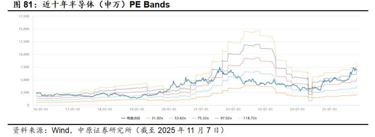 目前半导体行业PE估值高于近十年中位值及平均值。目前申万半导体行业PE(TTM)约为100倍,近十年申万半导体行业PE(TTM)最大值约为165倍、最小值约为32倍,申万半导体行业PE(TTM)近十年中位值约为75倍、平均值约为79倍,目前半导体行业PE估值高于近十年中位值及平均值。