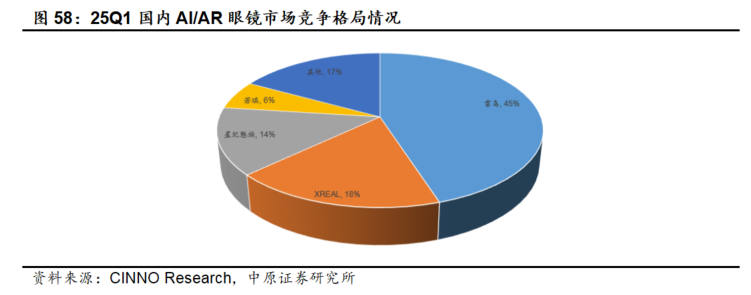 雷鸟目前在国内AI/AR眼镜市场处于领先地位。在消费级AI/AR眼镜市场中,头部品牌与新兴势力正上演着激烈的角逐。根据CINNO Research的数据,2025年一季度国内消费级AI/AR市场销量中,雷鸟创新以45%的市场份额位居第一,展现出“硬件+算法+生态”的垂直布局实力;XREAL销量份额占比18%,排名第二;星纪魅族位列第三。