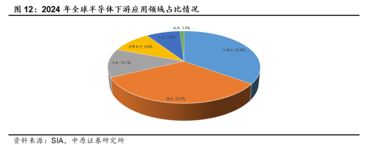 全球半导体下游需求呈现结构性特征,消费类需求占比较高。根据SIA的数据,2024年全球半导体下游应用领域中计算机占比34.9%、通信占比33.0%、汽车占比12.7%、消费电子占比9.9%、工业占比8.4%、政府占比1%。由于消费类下游占比较高,目前智能手机、PC等消费类需求均处于恢复中,工业市场需求也开始复苏,AI算力硬件需求持续旺盛。