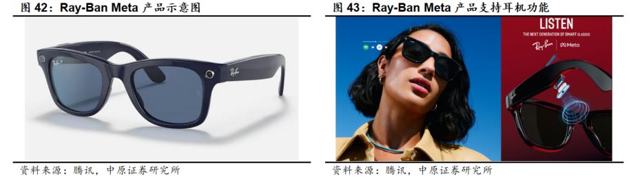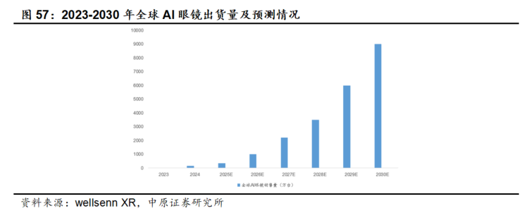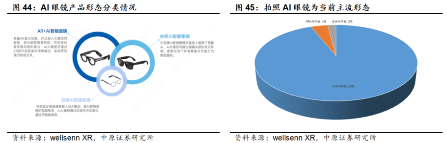 AI眼镜是在普通眼镜的基础上,增加AI功能,拍照AI眼镜为当前主流形态。AI眼镜的产品形态包括音频AI眼镜、拍照AI眼镜、AR+AI眼镜;传统蓝牙音频眼镜接入AI大模型,是AI眼镜的基础形态,AI大模型通过语音交互方式提供基础的智能服务;拍照AI眼镜是在音频AI眼镜的基础上增加摄像头,AI大模型可通过摄像头感知周边环境,提供与当下环境具备交互能力的智能服务;AR+AI眼镜是具备AR显示功能、并且接入大模型的眼镜,部分眼镜具备拍照、空间定位等多模态感知能力,AI大模型可通过AR显示实现实时信息输出,实现更简便的信息交互。根据wellsenn XR的数据,2024年全球AI眼镜销量中94%为拍照AI眼镜,4%为AR+AI眼镜,2%为音频AI眼镜。