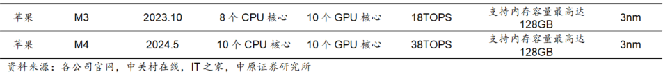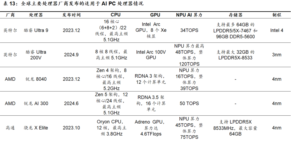 英特尔、AMD等芯片厂商持续迭代适用于AI PC的处理器芯片,NPU算力不断提升。2024年9月4日,英特尔发布超高能效的x86处理器家族——英特尔酷睿Ultra 200V系列处理器,CPU、NPU和GPU的整体平台算力高达120 TOPS,在实现跨模型和引擎的同时提供极具兼容和性能的AI体验,整体功耗降低了50%,使搭载该处理器为AI PC带来超前的低功耗表现。2024年6月4日,AMD为下一代 AI PC推出锐龙AI 300 系列处理器,采用全新的“Zen 5”架构,配备高达12颗高性能CPU核心和24个线程;采用基于全新 AMD XDNA 2 架构的专用AI引擎,NPU拥有50 TOPS的AI处理能力;采用全新的AMD RDNA 3.5图形架构,配备最新的AMD Radeon 800M系列显卡,带来流畅的帧速率和3A游戏体验。英特尔、AMD、高通和苹果等芯片厂商持续迭代适用于AI PC的处理器芯片,联想、惠普等PC厂商密集发布AI PC新品。