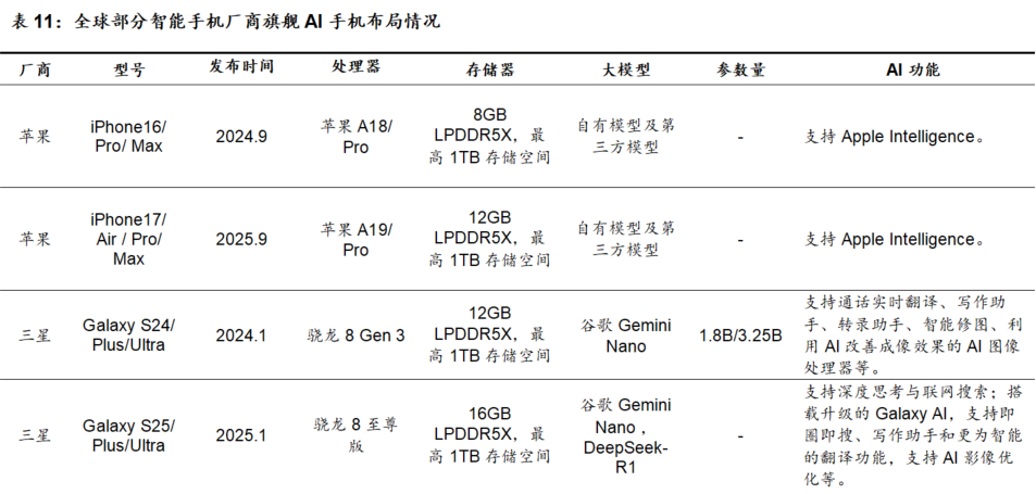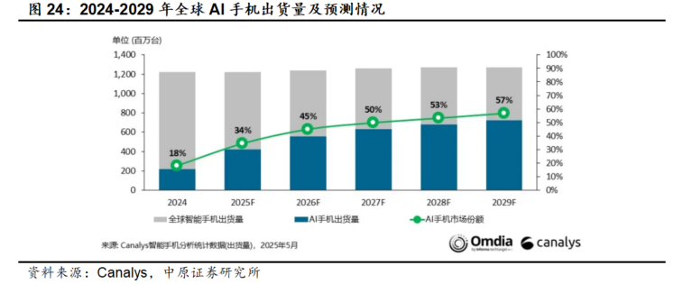 Canalys预计2025年AI手机渗透率将达到34%,端侧模型的精简以及芯片算力的升级将进一步助推AI手机向中端价位段渗透。2025年芯片厂商发布的新款次旗舰SoC,如Snapdragon 8s Gen4, Dimensity 9400e 已经具备了流畅运行端侧大模型的能力,Deepseek的出现也在很大程度上降低了大模型对于芯片算力的开销,在这两大因素的共同作用下,2025-2026年AI手机仍预计会保持高速渗透的趋势。根据Canalys的预测, 2024年全球智能手机出货量中18%为AI手机,预计2025年渗透率将快速提升至34%,预计2026年将达到45%。
