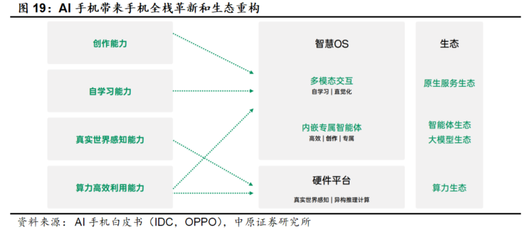 AI手机可以通过端侧部署AI大模型实现多模态内容生成、情境感知,能更自然的进行交互,并内嵌专属智能体。AI手机应具有创作能力、自学习能力、真实世界感知能力、算力高效利用能力。