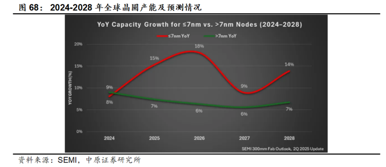 AI推动全球先进制造产能加速扩张。根据SEMI发布最新的《300毫米晶圆厂展望报告(300mm Fab Outlook)》,全球半导体制造行业预计将保持强劲增长势头,预计从2024年底到2028年,产能将以7%的复合年增长率增长,达到创纪录的每月1110万片晶圆;推动这一增长的关键因素是先进工艺产能(7纳米及以下)的持续扩张,预计将从2024年的每月85万片晶圆增长到2028年的历史新高140万片晶圆,增长约69%,复合年增长率约为14%,是行业平均水平的两倍;AI继续成为全球半导体行业的变革力量,推动全球先进制造产能加速扩张。