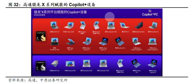 微软推出AI PC新品 Copilot+PC。2024年5月21日,微软推出搭载Copilot功能及Windows 11的全新AI PC产品Copilot+PC,宣布将AI助手Copilot全面融入Windows系统。除了Surface产品外,主要合作伙伴Dell、联想、三星、HP、Acer、Asus都会推出Copilot+PC产品。首批Copilot+PC笔电采用高通骁龙X Elit与 X Plus,NPU算力达到45 TOPS。