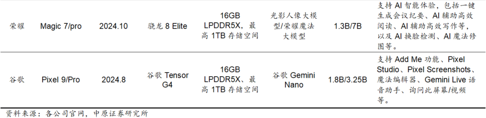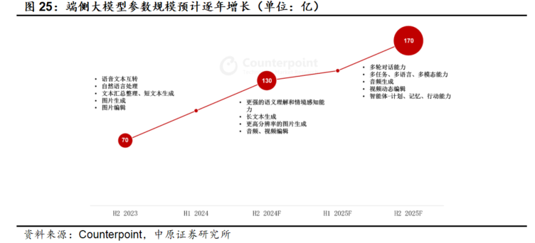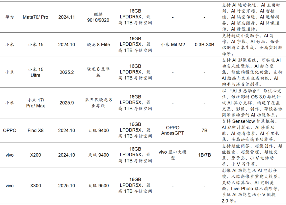 端侧大模型参数规模或继续增长,有望推动存储器容量需求大幅提升。目前OPPO Find X8 系列、vivo X200系列、以及荣耀Magic 7系列等AI手机已经成功实现70亿参数规模大模型的本地部署,预计AI算力将是未来SoC升级的重中之重,从而使端侧有望部署更大规模的大模型。根据Counterpoint的预测,预计2024年端侧大模型参数量将达到130亿,预计2025 年将增长至170亿。目前一般的智能手机搭载8GB内存,支持端侧大模型的AI手机需要更大容量的内存,并且随着大模型参数量提升,所需内存容量也随之增长。IDC及OPPO表示,16GB DRAM将成为新一代AI手机的基础配置。目前华为Mate 70系列、小米15系列、OPPO Find X8系列、vivo X200系列、以及荣耀Magic 7系列等AI手机已经支持16GB LPDDR5X,随着端侧大模型参数规模的继续增长,有望推动存储器容量需求大幅提升。