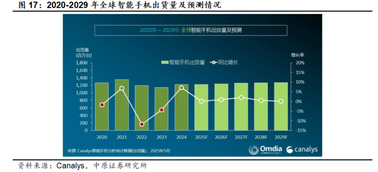 Canalys预计2025年全球智能手机出货量同比增长0.1%。2025年初市场遭遇了宏观经济、地缘政治等不确定性,使得消费情绪更加保守;此外,在经历去年末的节庆旺季后,厂商也纷纷着手优化库存水位,减缓出货流速。根据Canalys的预测,2025年全球智能手机出货量预计为12.2亿台,同比增长0.1%;逐渐退潮的低端价位段换机需求以及不明朗的全球地缘政治环境与地方政府政策的多变性将为今年的市场增长带来挑战,2025年至2029年市场预计以1%的年复合增长率温和增长。