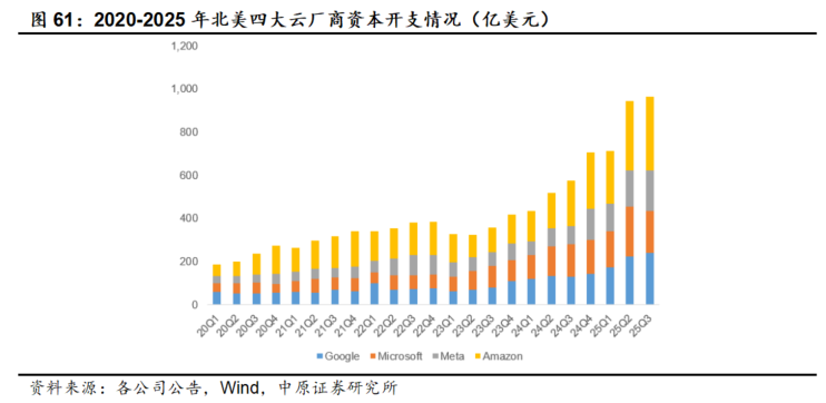 北美四大云厂商受益于AI对核心业务的推动,持续加大资本开支。受益于AI对于公司核心业务的推动,北美四大云厂商谷歌、微软、Meta、亚马逊2023年开始持续加大资本开支,2025年三季度四大云厂商的资本开支合计为964亿美元,同比增长67%,环比增长9%,推动AI算力硬件基础设施需求旺盛。